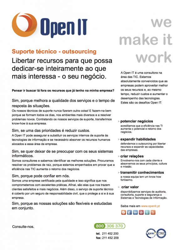 Prioridade: reduzir custos. A Open IT pode assegurar e substituir os serviços internos de suporte às tecnologias de informação e absorver os recursos humanos alocados a essa área da empresa.